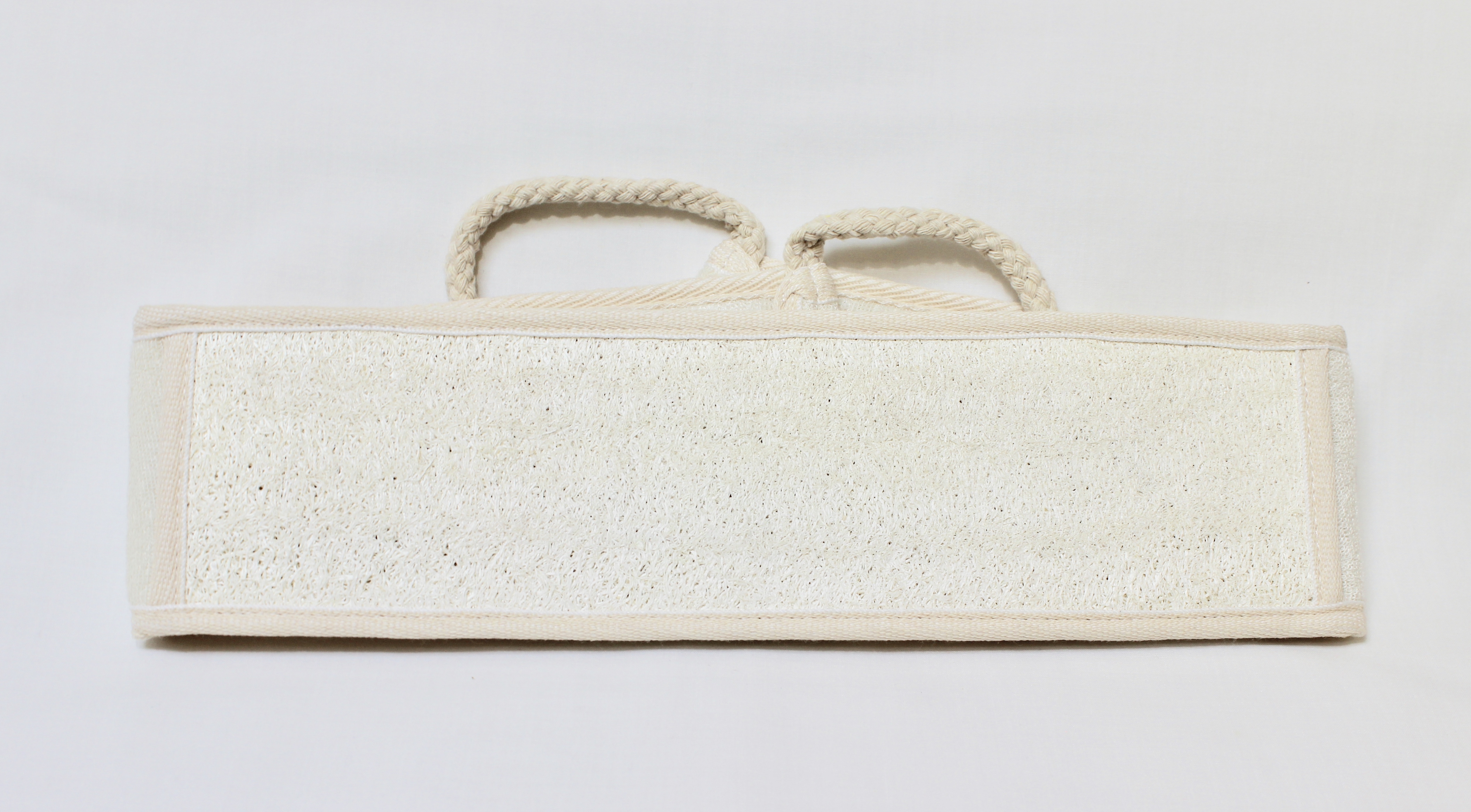 Our Terry Cloth and Loofa belt is about 34 inches long. This 2-sided belt is great for washing the back-side of your body. It has handles on either side for ease of use. The Terry Cloth side can also be used for applying body lotion on your back!